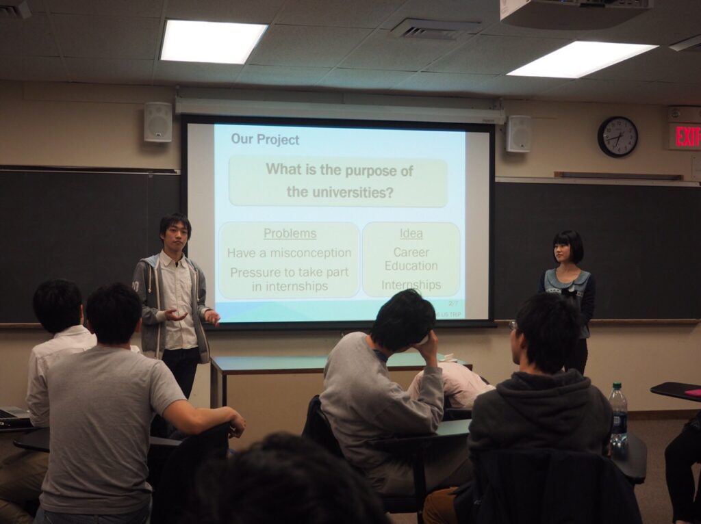 We learned that students in the USA had to take part in internships to get a job, but that they had to study hard in universities. They should do preparations for school to keep up with classes, and companies check GPA in recruiting activities. However they were not forced to study by this situation, but they voluntarily did with following their future plan, which was impressive for us.