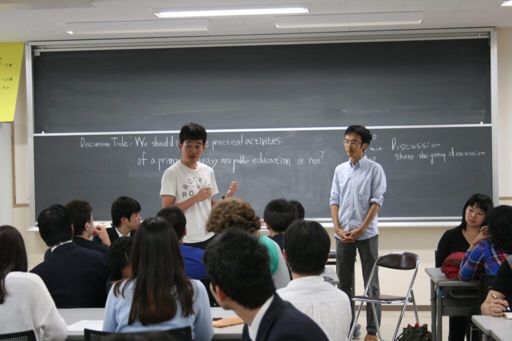 Four groups—KIP students, Nakatani students, university students from Akita, and high school students majoring in agriculture—gathered to debate whether hands-on experience in primary industries should be mandatory.